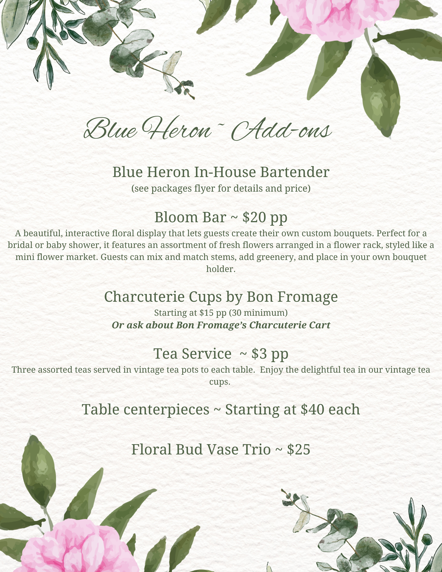 Check out our options for your special event…Tea Party, Shower Package, Hourly Rental, Add-ons and Bartending Packages!